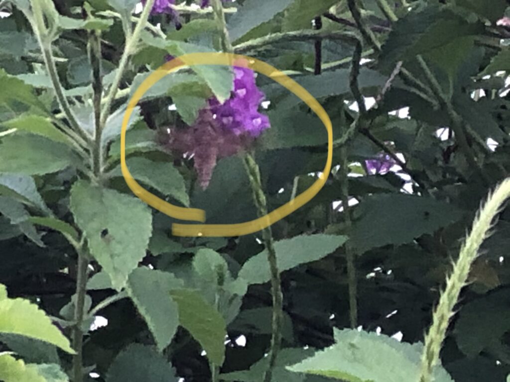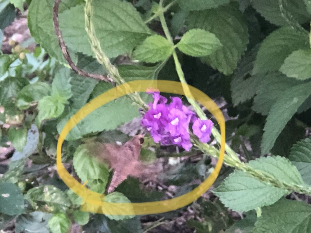 So I started looking around. The Porterweed is exceptionally huge right now and our purple one is blooming up a storm. Sure enough, this strange looking winged creature started feasting, darting around like it was in the last stretch of a race. That is very hummingbird, but this did not look like a hummer. In fact it smacked of bee. There was a pointed “tail.” The body definitely had segments like an insect. And the wings were going like crazy. The body looked fuzzy. Then I spotted antennae, and knew this is no bird.