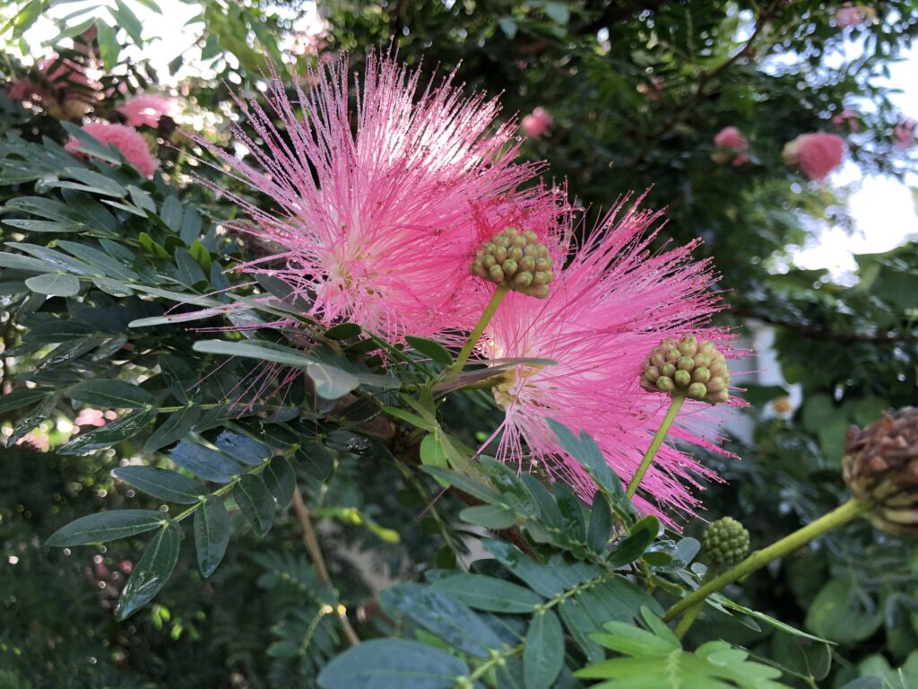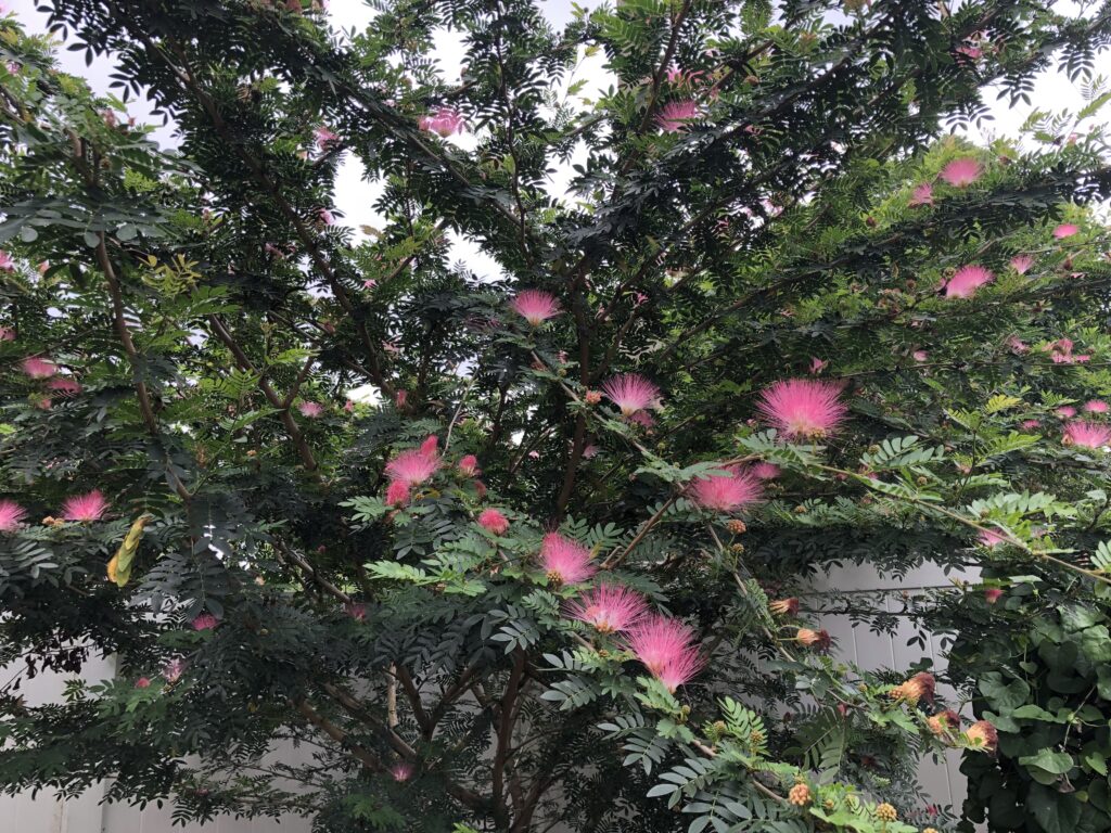 This is commonly called a Powderpuff Tree. I am giving you its scientific name, so if you want one, you can get the correct one, since several plants are nicknamed Powderpuff Tree. This pink beauty is a Callianda Haematocephala. Learning about it later took some work. There are not a lot of articles about it.